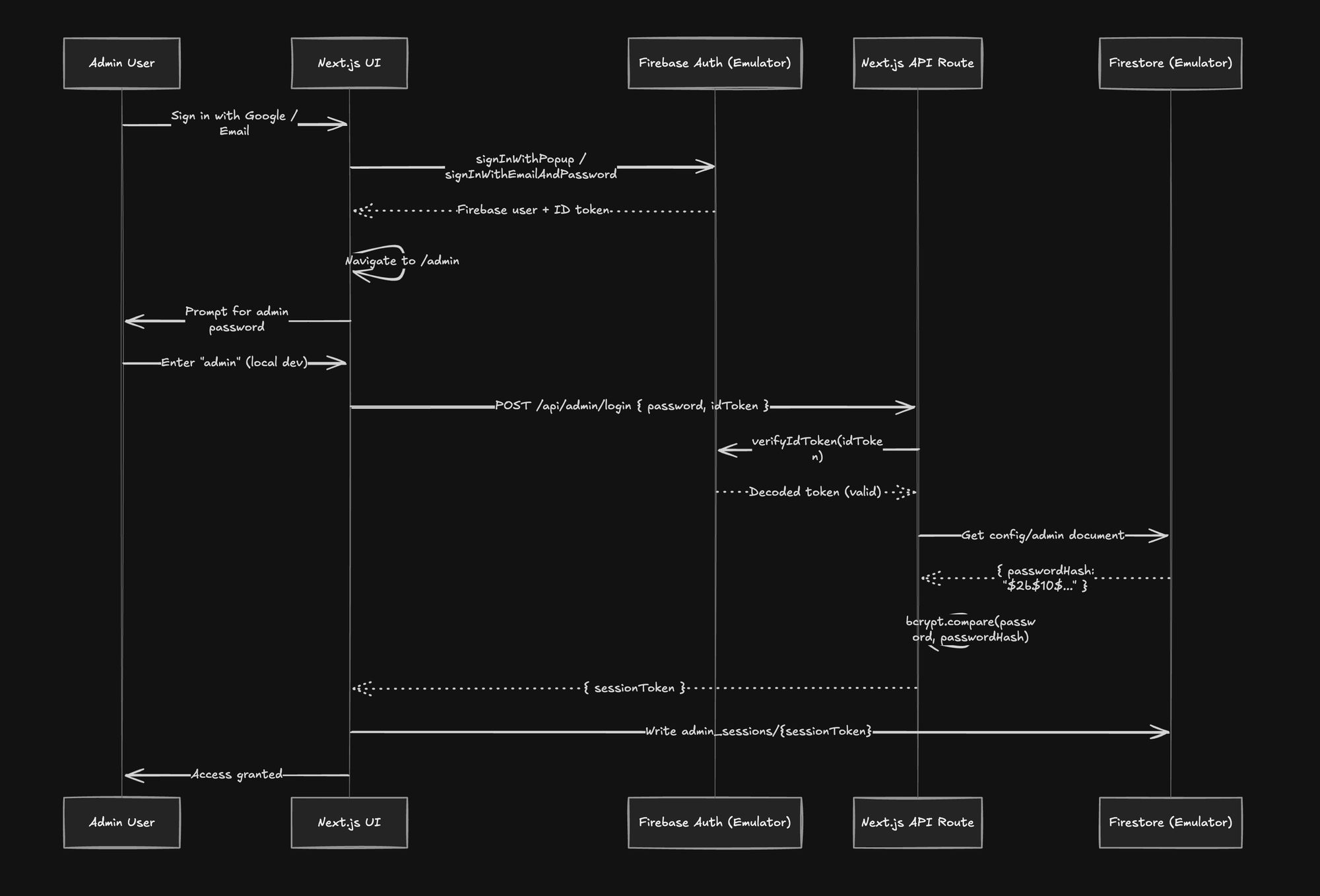 The admin system uses a two-factor authentication model: Firebase Auth first (any account can sign in), then a separate admin password verified against a bcrypt hash stored in Firestore: