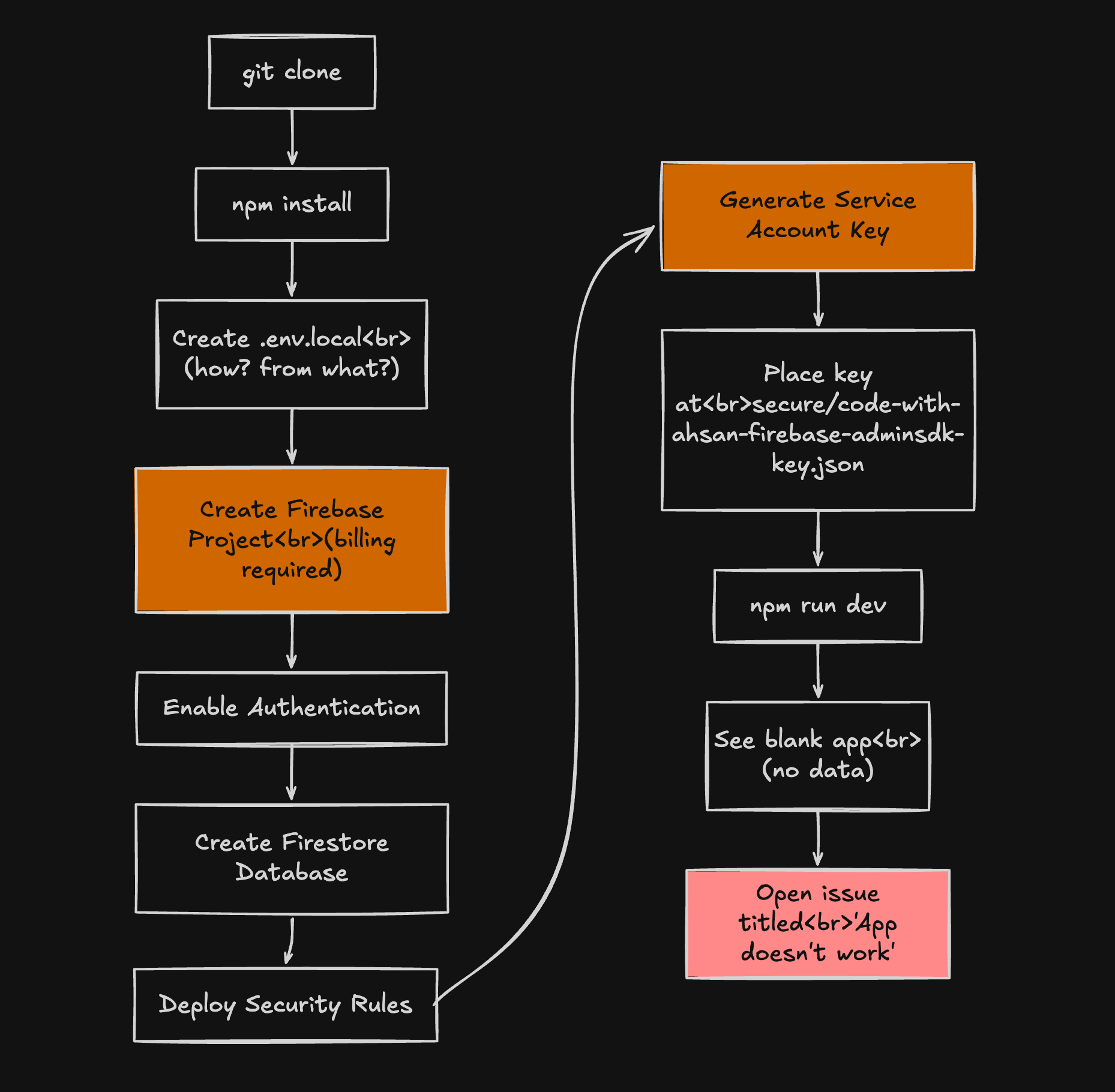Sure. And then what? Paste your production Firebase credentials into a.envfile you had to guess the shape of? Hope you already have a service account key sitting in asecure/folder that nobody told you about? Stare at a blank screen wondering if the app is broken or if you just need to have attended a secret meetup to get the tribal knowledge?